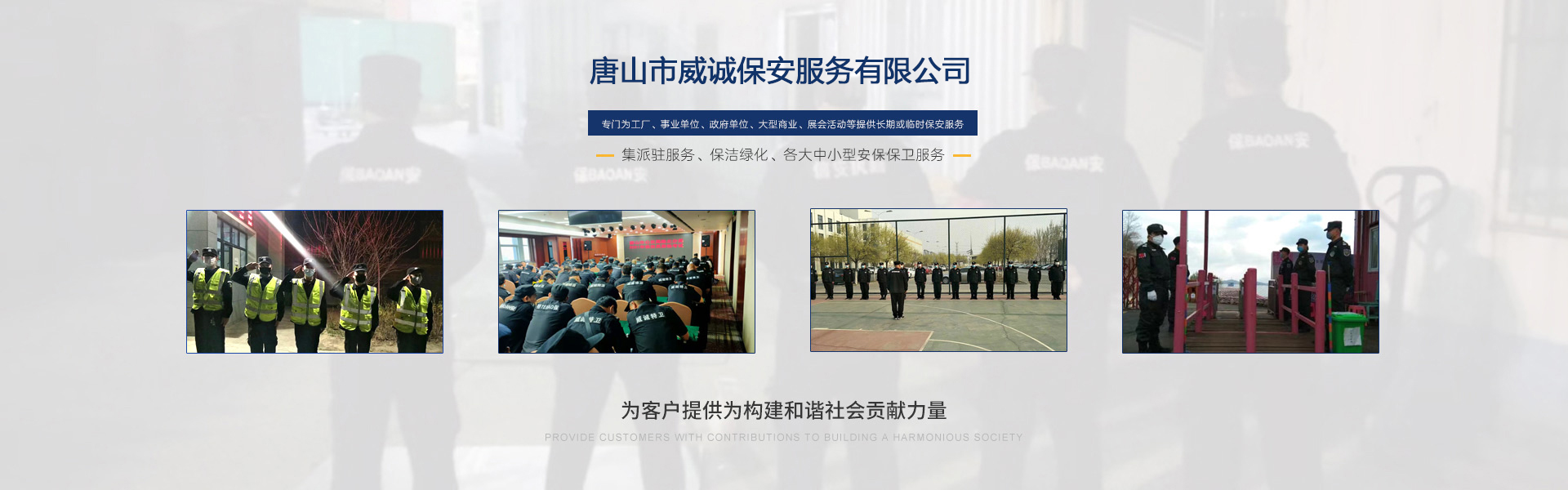 唐山市威誠保安服務(wù)有限公司自成立以來以“嚴防死守、忠于業(yè)主”為服務(wù)原則,以“客戶滿意、 合作共贏”為根本目標。以科學的管理、多方位多層次的服務(wù),建立了首問責任制,完善了走訪、回訪 、滿意度調(diào)查、末位淘汰的預(yù)警管理,不斷提高服務(wù)質(zhì)量,提高業(yè)主滿意度,提高企業(yè)形象。秉承“誠 實守信,紀律嚴明,團結(jié)協(xié)作,致精致誠”的服務(wù)理念,為客戶提供高品質(zhì)、多方位、專業(yè)化的保安服務(wù)。 本公司制定了嚴謹?shù)亩ㄏ蛘猩徢芭嘤枴⒖己虽浻谩徶信嘤枴⒊掷m(xù)培訓、末位淘汰制等一整套完善的管理體系。可以根據(jù)客戶的要求實地勘察評估,以量身定做的方式提供安保防范服務(wù)。